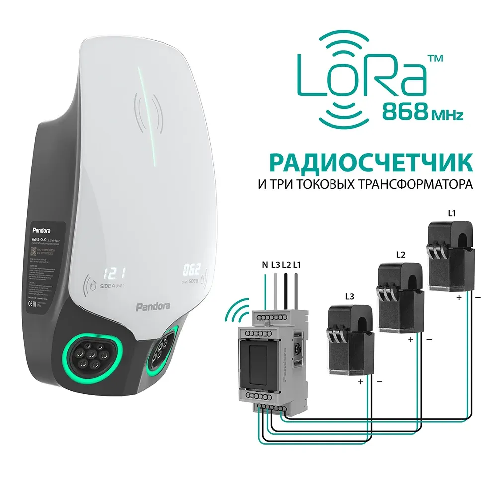 Автоматическая регулировка мощности зарядной станции в зависимости от общей загрузки сети (трансформаторы тока и модуль LoRa ТТ в комплекте), с передачей данных о нагрузке на сеть по каждой фазе по радиоканалу LoRa, без необходимости прокладывать слаботочную линию.